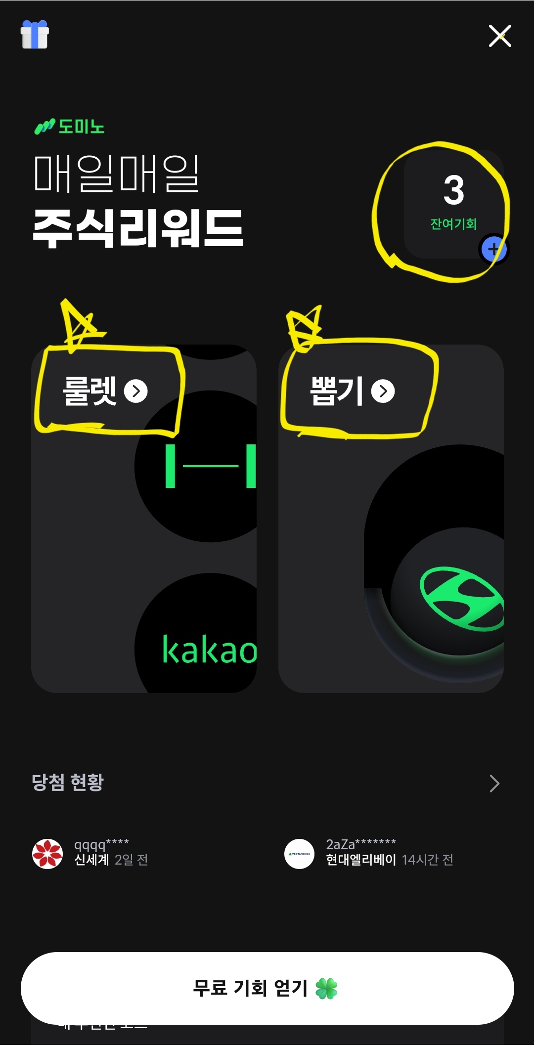 매일 2번의 기회가 무료로 주어 집니다..무료 주식 가즈아!!