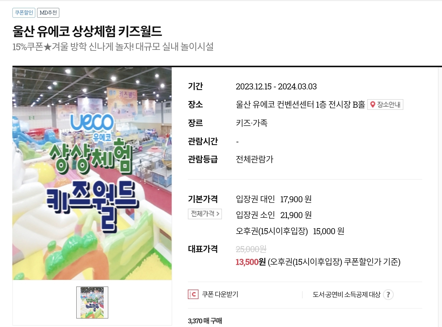 기본 할인에 지금 추가 할인 쿠폰까지 주고 있어서 키즈월드 가실분들은 필수로 꼭 여기서 입장권을 사가세요.